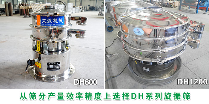 DH系列旋振篩型號齊全產(chǎn)量大,型號分為直徑400mm型、600mm型、800mm型、1000mm型、1200mm型、1500mm型、1800mm型、2000mm型等八種標準機型。篩分分級橡膠粉處理量可達400kg-2T/h,可將物料沿著篩網(wǎng)篩面充分篩分,過網(wǎng)率高篩分精度可達95%。