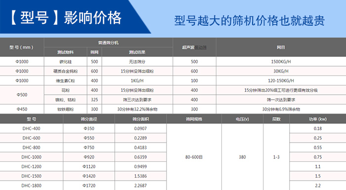 超聲波篩分機(jī)型號(hào)有:DHC-400、DHC-600、DHC-800、DHC-1000、DHC-1200、DHC-1500、DHC-1800、DHC-2000等八種標(biāo)準(zhǔn)直徑型號(hào);不同型號(hào)的超聲波篩分機(jī)的價(jià)格就是不同,其中影響型號(hào)的的因素有:篩網(wǎng)(1—5層)、材質(zhì)(不銹鋼、碳鋼)、振動(dòng)電機(jī)(功率不同)等。